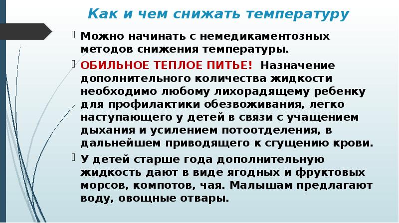 - Увеличение потребления жидкости больным. Чем больше ребенок будет пить, тем больше тепла отдаст его организм.