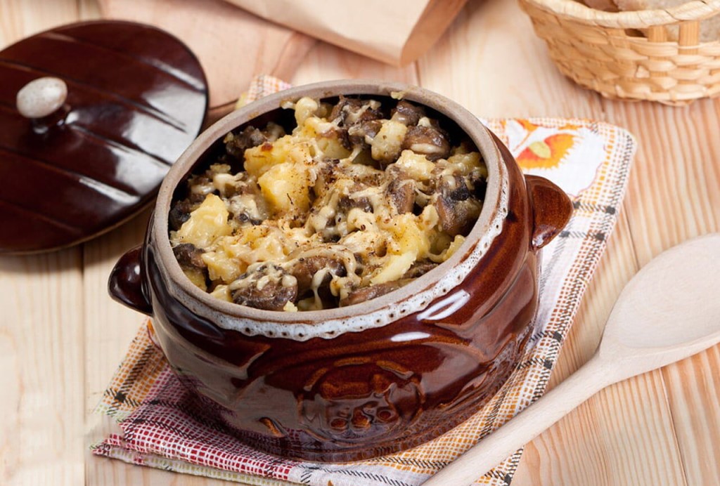 Картошка с фаршем и грибами в горшочках в духовке