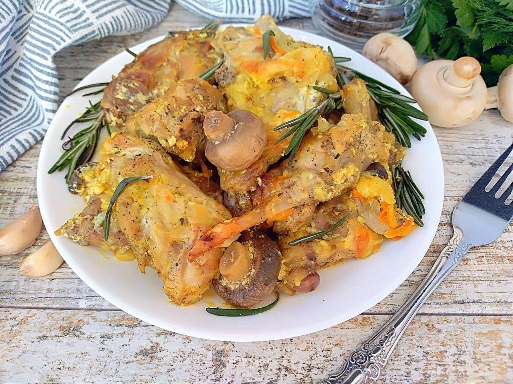 Кролик в духовке, запеченный с грибами в сметанном соусе
