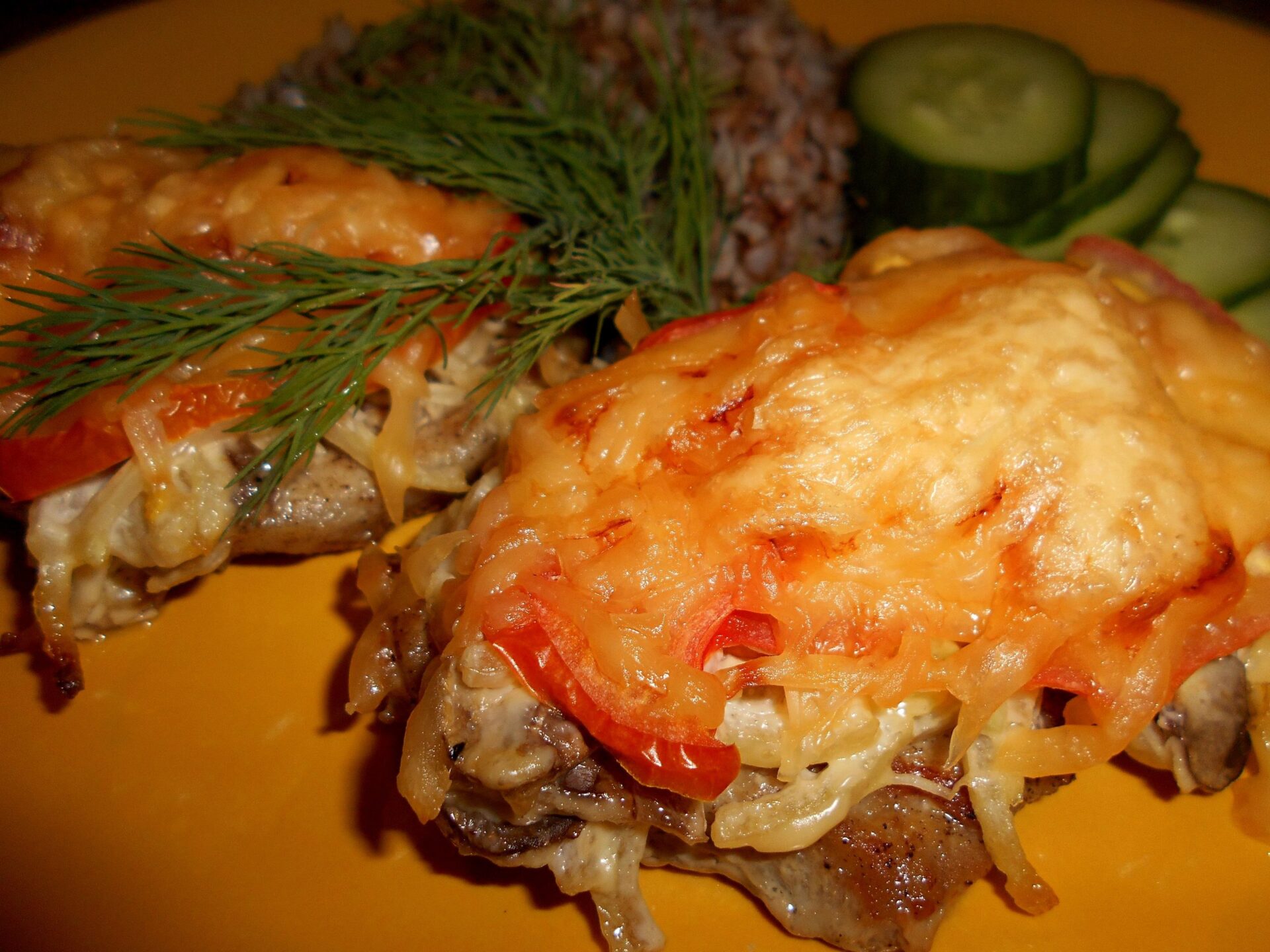 - Мясо с грибами, сыром и помидором